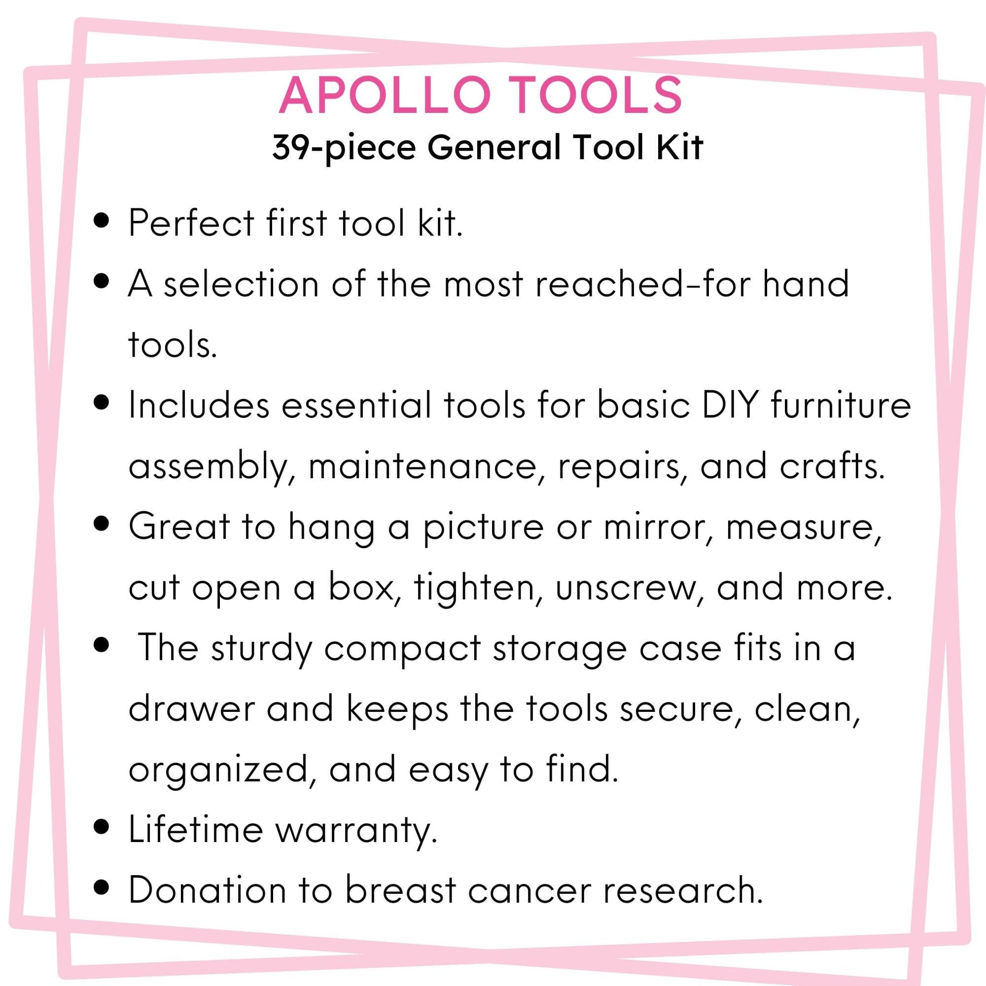 DONATION TO BREAST CANCER RESEARCH. Apollo Tools, Ltd is donating $0.50 from this purchase to the Breast Cancer Research Foundation®. BCRF’s mission is to advance the world’s most promising research to eradicate breast cancer. For more information about BCRF, visit bcrf.org. You can read more about Apollo Tools' breast cancer commitment here.